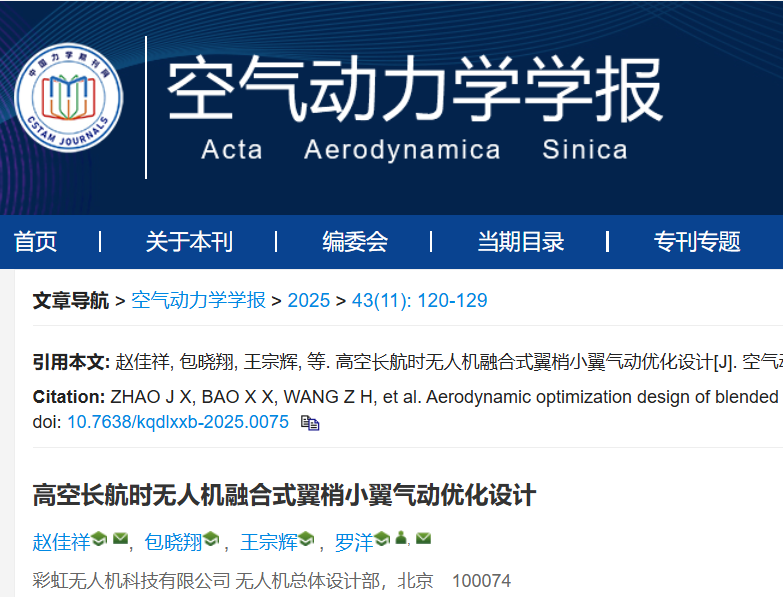 研究成果以“Aerodynamic optimization design of blended winglets for HALE UAVs”为题发表于空气动力学学报。本文第一作者:彩虹无人机科技有限公司赵佳祥。