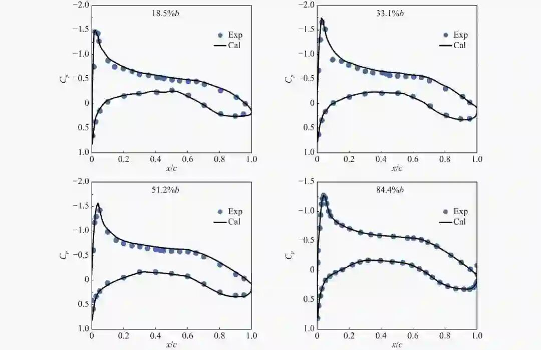 图2:DLR-F4标模典型截面(18.5%b、33.1%b、51.2%b、84.4%b)的压力分布计算结果与实验数据的对比