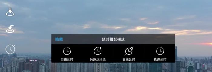 延时摄影模式目前有4种:自由延时模式,环绕延时模式,定向延时,轨迹延时。我最常用的是轨迹延时和环绕延时,偶尔会使用定向延时。如果只是想记录当前景色的话,自由延时功能更推荐有一定飞行经验的人使用,因为此模式下需要一直操控无人机飞行,操作不当很容易导致最后的素材会出现抖动。