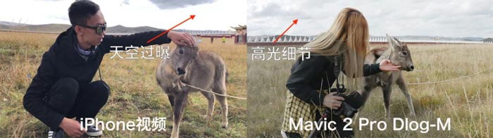 很多初学者可能会问,为什么要使用Dlog-M这样颜色模式?如果还需要后期调色那岂不是很麻烦?其实它最大的作用就是获取更大的动态范围,尽可能多地保留画面的高光和阴影的细节,下面这张图对比了iPhone视频截图和“御” 2 专业版使用Dlog-M颜色模式的截图,孰优孰劣一目了然。